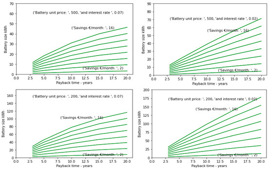 Different investment scenarios showing what battery capacity can be expected dependent on interest rates, payback time and potential savings in power tariffs due to curtailment. Upper plots: battery unit price of to €500 per kWh and interest of, respectively, 7% and 2%. Lower plots: battery unit price of to €200 per kWh and interest of, respectively, 7% and 2%.