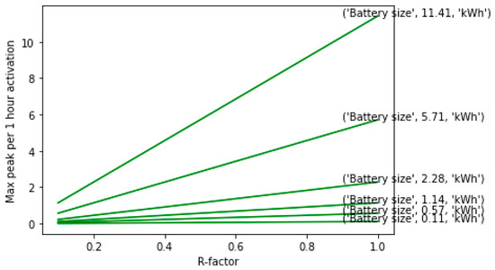 It should be noted from this that the R-factor is susceptible to the discharge/charge routines applied. The likelihood of individual peaks being characterized by a better R-factor than a continuous train of peaks is high. That caters for a smaller battery with lower investments but also a higher frequency of charge/discharge. A smaller and more affordable battery might thus be subjected to a higher frequency of deep cycles and be exposed to an accelerated life-loss that would demand a shorter payback period for the investment. A bigger battery can sustain a duration of multiple peaks in a row without recharging, until the state of charge has reached the minimum level. Hence, the frequency of deep discharge/charge cycles will be lower, which could extend the battery life and thus the duration of the payback period.