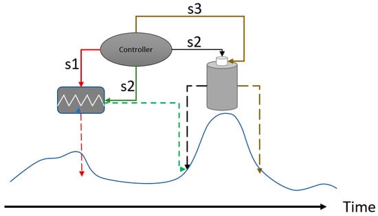 The “wrench and cut” principle implies that demand response and battery operations should be combined if possible. This is illustrated in Figure 9. There, it is implied that instead of shaving off the load indicated by the blue line (continuous peaks and valleys, reflecting energy demand A1), it would be better to concentrate the load to a specific part and use the battery for a shorter period, in order to shave off the peak and reduce the peak load further (red dashed lines).