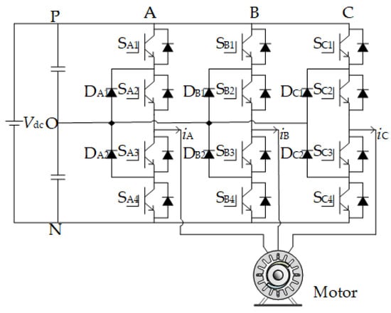 The topology of the NPC three-level inverter is shown in Figure 1, Vdc is the DC-link voltage, the upper and lower capacitors C1 and C2 are capacitors in parallel with the DC bus, each shares half of the DC bus voltage, and the values are defined as vC1 and vC2, respectively. The AC side is composed of three-phase bridge arms, representing A, B and C phases, each phase has two clamping diodes DX1~DX2 in series and four insulated gate bipolar transistor (IGBT) SX1~SX4 in series, iX is the three-phase load current, where X∈{A, B, C}.
