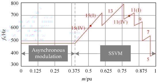 According to the above design principle of switching sequence, reference [22] gave the switching sequence with the lowest harmonic content of output waveform under different pulse number conditions, and inverter switching frequency can be limited over a wide output frequency range. This method divides the working range of the inverter into asynchronous space vector modulation interval and SSVM interval according to the modulation index m. When m ∈ [0, 0.4), the output frequency of the inverter is low, and the phase voltage can have a high number of pulses at low switching frequency. The asymmetric effect caused by asynchronous modulation is small, which avoids the frequent switching between different pulse numbers of SSVM and is simpler to implement. The control effect is excellent, so the asynchronous space vector modulation strategy is adopted; when m ∈ [0.4, 1), the output frequency of the inverter increases, the number of phase voltage pulses decreases, and enters the SSVM interval to ensure the three-phase symmetry. At the same time, the switching frequency should not exceed the allowable value of the selected power device. In the literature [22], the segmentation basis of different pulse numbers on the modulation index in the interval of SSVM has been analyzed and discussed in detail. The variation of pulse number with modulation index is shown in Figure 3, the brackets after pulse number indicate different clamping methods.