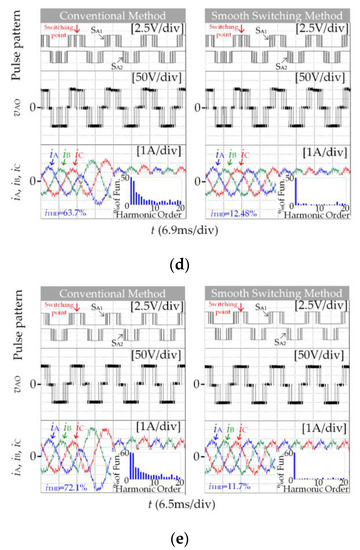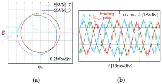 The motor model in the experiment is a non-ideal model that is affected by environmental factors such as temperature and noise. Its parameters such as inductance and resistance will also be inconsistent with the theoretical value due to manufacturing errors. The motor model in the simulation is an ideal model that is not affected by any factors. Comparing the simulation results Figure 4b and the experimental results Figure 12e when SSVM_7 switches to SSVM_5, it can be seen that, during the experiment, the motor is affected by many external factors, and the current impulse oscillation is more serious when the switch is directly switching. Therefore, the necessity of adding a smooth switching strategy to the modulation method in industrial applications is more clearly demonstrated.