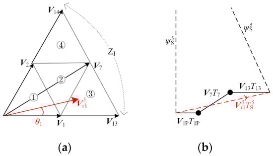 According to the space vector diagram shown in Figure 2, the change rate of flux trajectories of each reference voltage vector in TS can be obtained. Taking P = 5 as an example, the position of the reference voltage vector is shown in Figure 5a, = 1/30 fe, and rotates 12° per sub-cycle. The switching sequence used to synthesize is: V1P→V7→V13, and the flux trajectories of is shown in Figure 5b. In the figure, the black solid line is the actual flux trajectories change, and the red dotted line is the equivalent flux trajectories change rate.