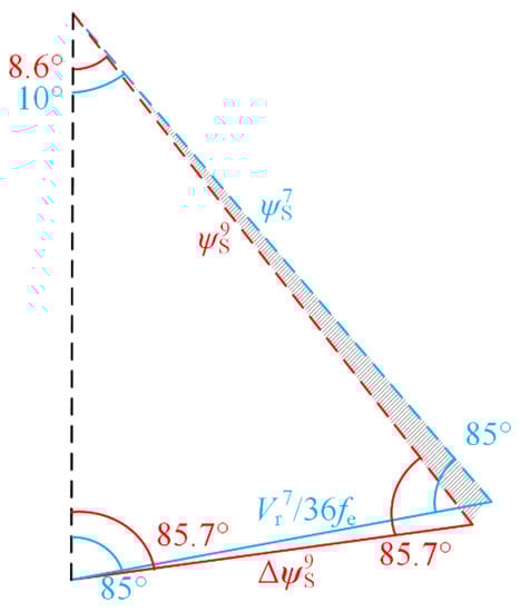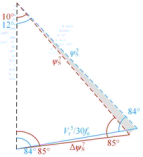 According to the flux trajectories of SSVM_7 and SSVM_5 shown in Figure 6, the stator flux vector of SSVM_7 rotates 10° in each sub-cycle, and the reference voltage phase angle changes from 5° to 15°. The stator flux vector of SSVM_5 rotates 12° in each sub-cycle, and the reference voltage phase angle changes from 6° to 18°. Due to the different flux trajectories change rate, the angle of flux vector rotation is different at the end of the reference voltage vector action, resulting in angle deviation, such as the shadow part in the Figure 6. If the two modulation methods are switched directly, due to the angle of deviation of the shadow part in the figure, it will cause the flux trajectories to deviate. Therefore, the reference voltage phase angle needs to be compensated, in order to make the flux trajectories change rate the same during switching.