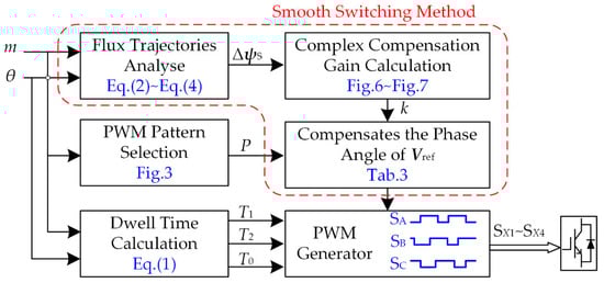 The calculation method of complex compensation gain k for switching between other pulse numbers in multi-mode SSVM method is the same as the above process. Due to space limitations, the calculation process is not listed step by step, the calculation results are shown only in Table 3, and the flow block diagram of the smooth switching method is shown in Figure 8. According to Figure 8, the proposed smooth switching strategy first needs to calculate the flux trajectories before and after switching according to Equations (2)–(4); Then, draw flux trajectories change rate, such as Figure 6 and Figure 7, and the value of k is calculated; Finally, according to the value of k in Table 3, the reference voltage vector phase angle is compensated.