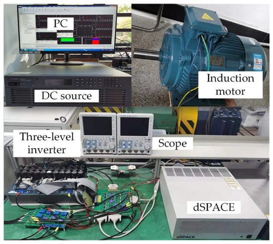 In order to verify the effectiveness of the proposed smooth switching method, and build a rapid prototyping experimental system based on dSPACE three-level inverter. The dSPACE® DS1007 rapid prototyping experimental system is used as the controller, the Infineon® IGBT module F3L75R07W2E3 is used as the power circuit. The experimental system also includes DC power supply, voltage/current sensor, PC and signal conversion circuit. Then, the experimental verification is carried out in a 7.5 kW induction motor. In order to clearly prove that the smooth switching of the motor can be achieved by using only the modulation strategy, the asynchronous motor is directly powered by an open-loop NPC inverter, and the sampling frequency of the dSPACE board is set to 50 kHz. A comparative analysis was conducted, about the phase angle of the reference voltage vector is not compensated and compensated when switching different pulse numbers. The experimental system and experimental parameters are shown in Table 4 and Figure 9.