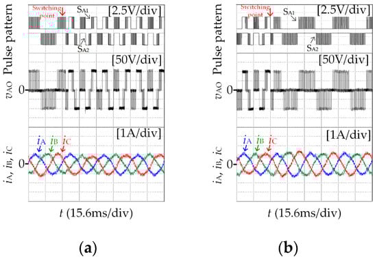 Experimental results of asynchronous modulation and SSVM_15(IV) switching. (a) Asynchronous modulation→SSVM_15 (IV). (b) SSVM_15 (IV)→asynchronous modulation.
