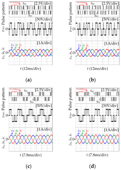Experimental results of different clamping method switching of SSVM. (a) SVM_15(IV)→SSVM_15(I). (b) SSVM_15(I)→SSVM_15(IV). (c) SVM_11(IV)→SSVM_11(I). (d) SSVM_11(I)→SSVM_11(IV).