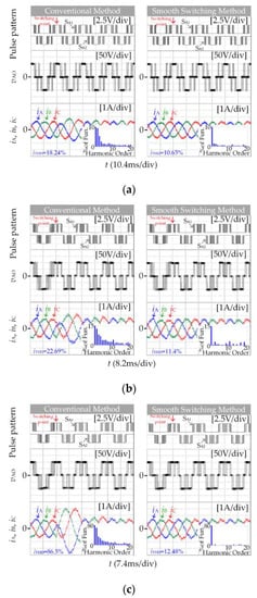 The top experimental diagram in Figure 12 is the pulse pattern of the power devices SA1 and SA2, and the position of the switching point can be seen through the waveform when the motor frequency rises in the multi-mode SSVM method. When switching between different pulse numbers, the three-phase current waveform will produce impulse oscillation due to flux trajectories deviation. As the number of pulses decreases during switching, the impact oscillation becomes more and more obvious, as shown in the left experimental results. After using complex compensation gain to compensate the reference voltage vector phase angle before switching, flux trajectories deviation was corrected. From the right experimental results, the three-phase current does not appear impulse oscillation, and smooth switching is achieved. Similarly, the fundamental frequency of the motor decreases, the three-phase current will not also impulse oscillation.