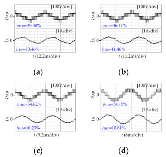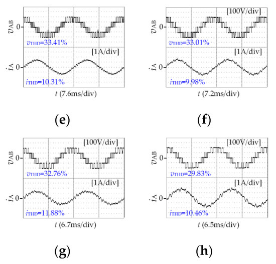 Experimental results of vTHD and iTHD. (a) m = 0.51, P = 15(IV). (b) m = 0.56, P = 15(I). (c) m = 0.68, P = 13. (d) m = 0.78, P = 11(IV). (e) m = 0.82, P = 11(I). (f) m = 0.86, P = 9. (g) m = 0.93, P = 7. (h) m = 0.96, P = 5.