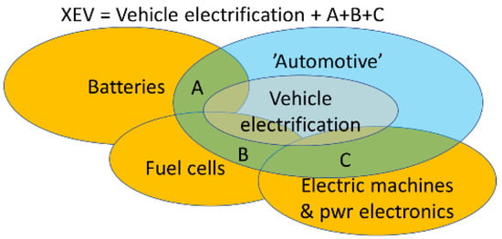 The identification of publications was based on queries. Queries use search terms which can be combined with AND, OR, and AND NOT. In addition, entities such as countries, institutions, and authors were used. The search strategy is illustrated in Figure 1. Vehicle electrification publications, from now on called XEV publications, are the sum of “Vehicle electrification” and the overlapping areas joining the enabling technologies and the automotive domain (Figure 1 is not to scale).
