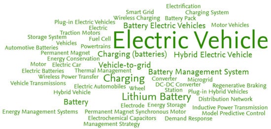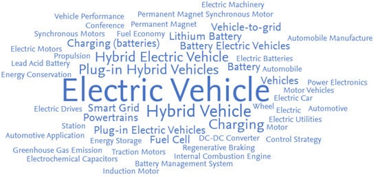 First, word clouds for 2012 and 2021 were compared. They were based on Elsevier’s Fingerprint engine, which uses the title, abstract, and keywords to generate key phrases. The larger the font, the higher the relevance. To some extent, the word clouds mirror the query used to extract the publications. However, some search terms are clearly represented in the word clouds, whereas others are not. The green word cloud in Figure 3 is based on 12,809 XEV publications from 2021. The blue word cloud in Figure 4 uses 5410 XEV publications from 2012.