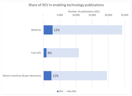 Given the design of XEV publications as a combination of vehicle electrification publications and publications in the enabling technologies mentioning automotive applications, it is interesting to study to what extent the enabling technology publications mention electric vehicle applications. In Figure 5, the darker blue areas represent the publications identified as both XEV and within one or several enabling technologies. For example, out of 24,228 battery publications, 12% or 2797 were also XEV publications.