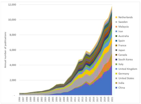 Table 1 features some indicators characterizing the XEV publications per country. Data for all publications in each country are also given to allow for comparisons. In line with Figure 3, China’s publication volume was the largest, with almost 15,000 publications over the five-year period 2017–2021, more than twice the volume of XEV publications produced in the second largest country, the United States. On the other hand, India was only larger than the United States in 2021, which means that during the period, it was the third largest country.