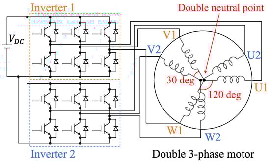 Against this background, dual inverter drive systems have been attracting attention for improving motor performance. The advantages of this system include a higher torque and power using two inverters of conventional ratings [1,2,3,4,5,6,7], and an increased degree of control freedom and reliability by increasing the number of phases [1,2,3,4,5,6,7,8]. The winding arrangement of the motor applied in this system can be broadly classified into 3 types with a phase difference between 2 sets of 3-phase windings of 0 degrees, 30 degrees, and 60 degrees in electrical angle [5]. In particular, the dual 3-phase motor with a phase difference of 30 degrees in the electrical angle shown in Figure 1 has attracted more attention because it completely eliminates the 6th harmonic component of the torque ripple, in addition to the above advantages of the dual inverter drive system [3,4,5,8].