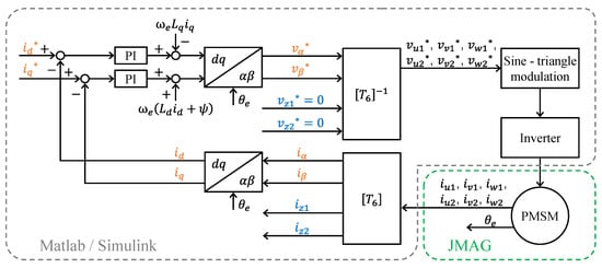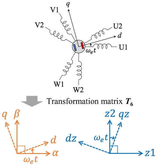where and are currents in the d-q subspace, and and are currents in the dz-qz subspace. As is clear from (8), the components in the α-β subspace are mapped to the d-q subspace only, and the components in the z1-z2 subspace are mapped to the dz-qz subspace only. Therefore, the transformation matrix (7) does not change the harmonic distribution discussed in the previous section.