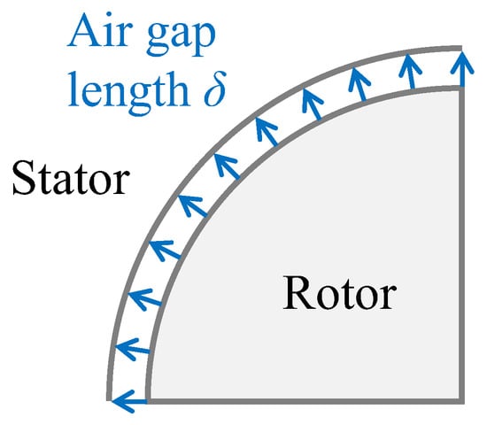 Essentially, the permeance distribution density, depends on the shape of the slot and rotor. However, taking these into account complicates the calculation of . Since the purpose of this chapter is to formulate the inductance and , ignoring the inductance saliency, a simple model shown in Figure 5 is used to model . As shown in Figure 5, the shape of the rotor is assumed to be a disk without the inductance saliency and the air gap width δ is uniform regardless of the position. In this model, if the magnetic resistance and magnetic saturation of the steel plate are neglected, can be approximated as only the permeance distribution density in the gap area.
