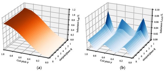 Lαβ and Lz1z2 for the coil pitch γ and the number of slots per pole per phase q are normalized by L and shown in Figure 6. From Figure 6, it can be confirmed that Lz1z2 is basically smaller than Lαβ regardless of the values of γ and q. The reason for this is that Equation (34a,b) are heavily influenced by the inverse of n2, with the former dominated by the term at n = 1 and the latter by the terms at n = 5 and 7.