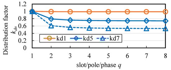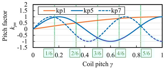 The magnitude of Lαβ depends on the winding factor kw1 for the first spatial order, and the magnitude of Lz1z2 depends on the winding factors kw5 and kw7 for the fifth and seventh spatial order. Figure 7 shows the pitch factor kpn for the coil pitch γ and Figure 8 shows the distribution factor kdn for the number of slots per pole per phase q. From Figure 6a, we can see that Lαβ is larger when the coil pitch γ is larger. From Figure 7, it can be seen that the trend of Lαβ is similar to that of the pitch factor kp1 for the 1st spatial order. The fact that Lαβ does not show much dependence on the number of slots per pole per phase q is also similar to that of the distribution factor kd1 for the 1st spatial order in Figure 8. On the other hand, Figure 6b shows that the magnitude of Lz1z2 has valleys around the coil pitch γ of 2/6 (=0.333) and 5/6 (=0.833) and peaks around 1/6 (=0.167), 4/6 (=0.667), and 1. From Figure 7, it can be seen that this trend is influenced by the pitch factors kp5 and kp7 for the 5th and 7th spatial order. Furthermore, the larger the number of slots per pole per phase q, the smaller Lz1z2 is, and this tendency is also similar to the distribution factors kd5 and kd7 for the 5th and 7th spatial order in Figure 8.