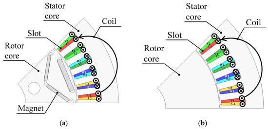 To verify the validity of the theoretical inductance equations presented in (34a,b), comparisons were made between the theoretical and FEA values. The parameters of the motor for evaluation are shown in Table 2. Since the motor for evaluation is a dual 3-phase motor with 48-slots/8-poles, the number of slots per pole per phase is q = 1. The model used for FEA is shown in Figure 9. For the shape of the rotor, Ld, Lq, Ldz, and Lqz are obtained for the interior magnet model with the saliency in Figure 9a, and Lαβ and Lz1z2 are obtained for the disk model without the saliency in Figure 9b. The purpose of this is to confirm that the parameters Ld, Lq, Ldz, and Lqz, which take into account the inductance saliency, show the same trend as Lαβ and Lz1z2, which ignore the saliency. The analysis was performed for the cases of the coil pitch γ = 1/6, 2/6, 3/6, 4/6, 5/6, and 1, with a two-layer structure where two coils fit in one slot, as shown in Figure 9.