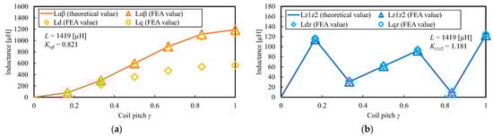 Figure 10 shows a comparison of the theoretical and FEA values. Note that in the calculation of the theoretical values, the permeance distribution is given approximately as in (28) and the errors due to differences from the exact permeance of the FEA model are introduced. Therefore, the theoretical values of Lαβ and Lz1z2 in Figure 10 are multiplied by the correction factors Kαβ and Kz1z2, respectively, to the values calculated by (34a,b). From Figure 10, the theoretical values of Lαβ and Lz1z2 are in good agreement with the FEA values. Figure 10a also shows that Lαβ and Lq are close to each other. This is because Lαβ obtained using the model in Figure 9b is the ideal q-axis inductance. On the other hand, Ld is smaller than Lαβ because the magnetic resistance of the d-axis magnetic path is larger due to the presence of the magnet region. Figure 10b also shows that Ldz and Lqz are not affected by the saliency and are consistent with Lz1z2. These results confirm the validity of the theoretical inductance equations presented in (34a,b). It was also confirmed that the inductance values Ld, Lq, Ldz, and Lqz, which take into account the saliency, show the same tendency as the inductance values Lαβ and Lz1z2, which ignore the saliency.