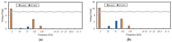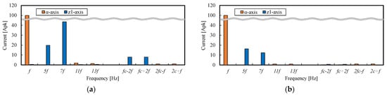 FFT results of α-axis and z1-axis currents: (a) Coil pitch γ = 5/6; (b) Coil pitch γ = 1.