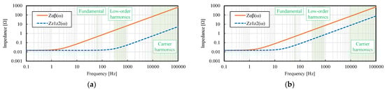 where ω is an arbitrary angular frequency. Figure 15 shows the frequency characteristics of Zαβ(ω) and Zz1z2(ω). From Figure 15, it can be seen that the impedance Zz1z2(ω) is small even in the high frequency band, basically due to the inductance Lz1z2 being smaller than Lαβ, regardless of the coil pitch γ. This results in large harmonic currents in the z1-z2 subspace even when the harmonic components in the voltage input of the z1-z2 subspace are small.