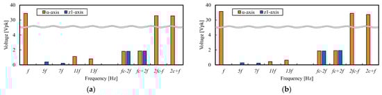 First, we discussed the cause of the excessive carrier harmonic currents (fc ± 2f [Hz] component) in the z1-z2 subspace for γ = 5/6 in Figure 14a. The FFT results of the applied voltage by the inverter are shown in Figure 16. From Figure 16, we see that for both γ = 5/6 and 1, the fc ± 2f [Hz] component is included in the z1-z2 subspace. On the other hand, Figure 15a shows that the impedance Zz1z2(ω) around fc ± 2f [Hz] for γ = 5/6 is very small, about 1 [Ω], despite the high frequency. This is thought to cause large harmonic currents at the corresponding frequencies.
