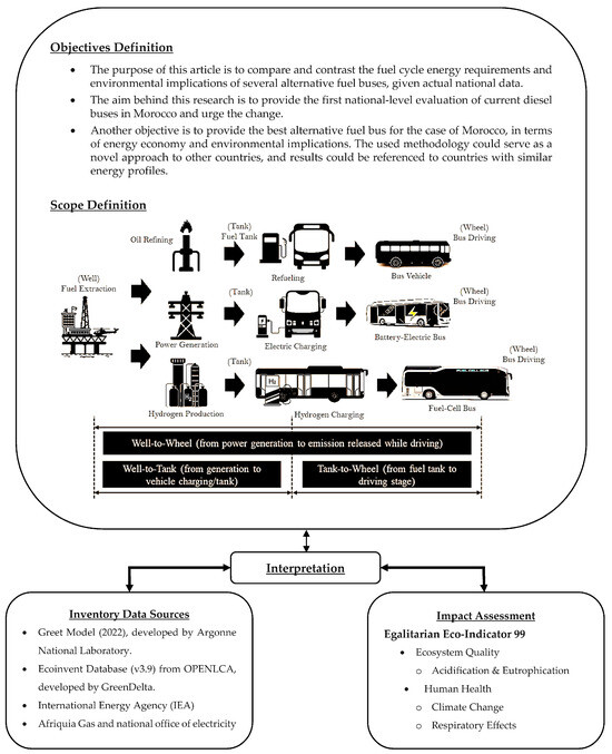Using the LCA framework, researchers around the world have recently begun to pay more attention to the environmental footprints associated with fuel extraction, fuel refining, and vehicle use. There have been a number of attempts to assess the energy and ecological effects of using alternative fuels in public transportation. Gabriel et al. [8] used the GREET model and Ecoinvent life cycle inventory to conduct a comparative life cycle analysis of electric, compressed natural gas, and diesel buses in Bangkok, Thailand. It was shown that switching from diesel to electric or compressed natural gas buses will reduce human and environmental health impact by 54–55% or 37–41%, respectively, resource depletion by 88% or 80%, and lifetime expenditures by 48% or 60%. Bangkok’s 14,127 diesel buses might reduce PM2.5 transportation emissions by 21% and 18% if converted to electric or compressed natural gas buses, respectively. Chang et al. [9] measured the carbon footprint of different fuel buses in Tainan City, Taiwan, using ISO/TS 14,067:2013 in a case study. Liquefied natural gas buses emitted 63.14 g CO2e per km, diesel buses 54.6, LPG buses 47.4, plug-in electric buses 37.82, and hydrogen fuel-cell buses 29.17, which makes the latter the best alternative in terms of CO2e emissions. Iannuzzi et al. [10] studied fuel-cell bus alternative to diesel buses in the city of Rosario, Argentina, using the input–output hybrid LCA method. The authors considered different hydrogen production processes, from grey hydrogen to green hydrogen. Jwa and Lim [11] performed a life cycle study for lithium-ion battery-electric buses and diesel buses using the GREET model. The diesel bus and electric bus were evaluated for energy consumption and pollutants. From an energy and environmental perspective, electric buses were better than diesel buses. As for Morocco, Jelti et al. [12] conducted an environmental LCA of diesel buses, hybrid buses, electric buses, and fuel-cell buses in the city of Oujda, using the GREET model and Ecoinvent life cycle inventory. It was found that electric and fuel-cell buses are efficient and sustainable alternatives to public transport throughout the operational phase, and their deployment in Oujda city might reduce greenhouse gas (GHG) emissions and air pollutants during the well-to-tank (WTT) and tank-to-wheel (TTW) phases.