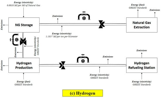Figure 4c reveals a potential hydrogen pathway in Morocco from natural gas using assumptions from GREET. Compressed natural gas would be imported and distributed to existing storage locations. From natural gas storage to hydrogen production to refueling stations, the energy and emissions data were based on the GREET model.