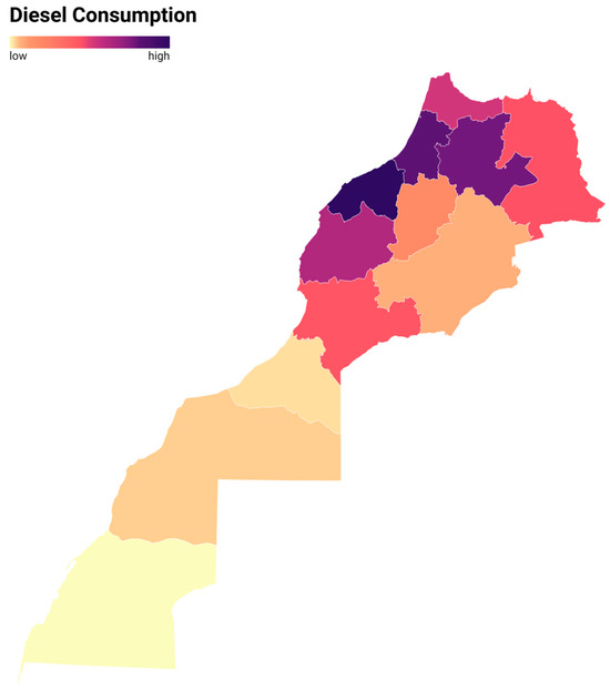It is worth mentioning that one tank of gaseous hydrogen has a mass of 39 kg net. In other words, fuel-cell buses consume around 12.8 kg of gaseous hydrogen per kilometer driven. A choropleth map of Morocco is drawn to summarize the results of energy consumption in Morocco by region under current diesel buses; the choropleth map was extrapolated to values in Table A3. From Figure 6, Zone 6 is the most energy-consuming region because of its largest bus fleet and largest daily journeys though 96% of the buses are EURO 6. Zone 6 contains the biggest metropolitan city in Morocco, Casablanca, which justifies the results. The Western Saharan regions record the lowest energy consumption of public buses. The link between energy consumption and economic growth is the subject of four competing theories of causation. The first is the so-called “growth hypothesis,” which states that more energy usage leads to a flourishing economy. The second theory is the “conservation hypothesis,” which states that an increased population demands more energy. Third, the “feedback hypothesis,” which proposes a two-way causal relationship between energy consumption and development, is discussed. Last but not least, the “neutrality hypothesis” proposes that growth and energy use have no statistically meaningful relationship [26]. However, according to [27] in 2020, three regions dominate Morocco’s GDP by roughly 61%, which are Zone 1 (12%), Zone 4 (16%), and Zone 6 (33%). The western Saharan regions barely contributed by 7% [27]. Therefore, there is a link between the region’s public bus energy consumption and GDP, in the presence of other links such as power engine types and mismanagement of public buses, which could be deduced from Zone 3 which contributes 7% GDP only but still emits and consumes more than Zone 1 (12%).