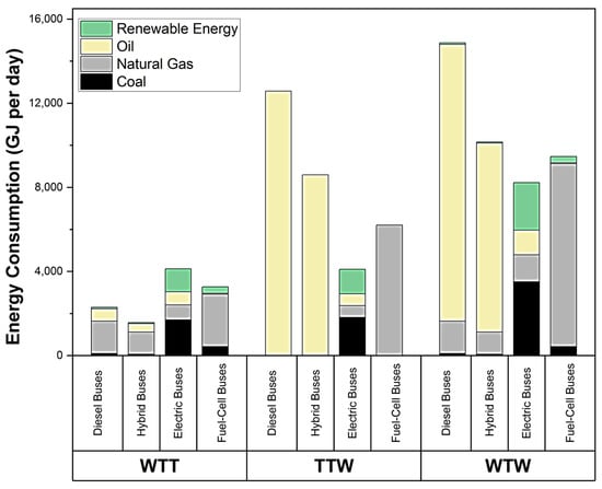 It is important to consider both renewable and nonrenewable energy sources when estimating the total amount of energy needed by alternative fuels. The three main types of non-renewable energy are coal, oil, and natural gas. There is a danger that these power sources would increase atmospheric pollution. In contrast, solar, wind, and hydropower are clean and are the key renewable resources in Morocco’s energy mix in 2030. There are daily updates that reflect the aforementioned scenario over all of Morocco. Daily energy consumption is provided that is consistent with the earlier mentioned situation in every region in Morocco. Figure 7 shows the energy consumption of the various bus technologies in TTW, WTT, and WTW.