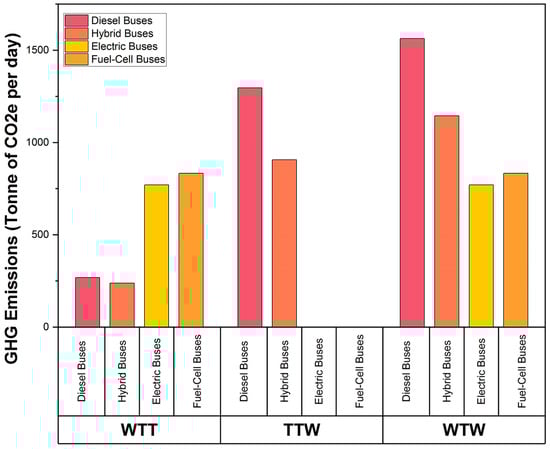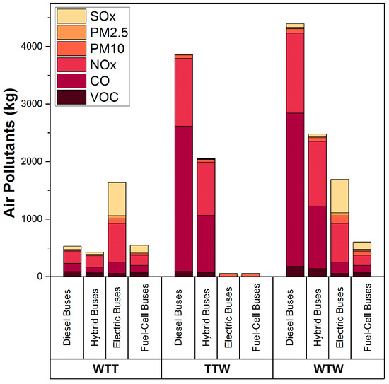 Results from the TTW phase show that both electric and fuel-cell buses produce zero emissions of harmful gases such as NOx, SOx, CO, and VOC and fewer PM10 and PM2.5 emissions. Furthermore, it is clear that hybrid buses, in comparison with other options, produce more NOx and VOC emissions while still being very near to the reference diesel buses. As opposed to diesel buses, hybrid buses reduce emissions by 2% for SOx and 61% for CO. Overall, taking into consideration both phases of the WTW, electric and hybrid buses will daily reduce all air pollutant emissions, whereas hydrogen cells decrease all emissions except for PM2.5 and SOx, which they increase by 15.8% and 100%, respectively.