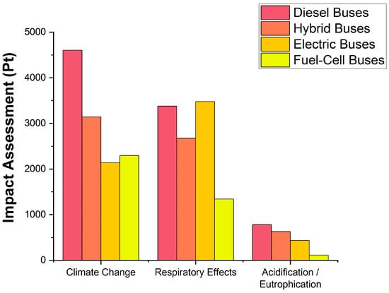 Climate change, respiratory effects, and acidification/eutrophication are computed to give a complete picture of the daily environmental impact assessment of different bus options and are summarized in Figure 10. When compared to other options, the reduced effects of climate change are most evident in the case of electric and fuel-cell buses, which have the lowest CO2 scores (2000 points for electric buses and 2200 points for fuel-cell buses). In terms of environmental impact assessment, electric buses and fuel-cell buses have the lowest environmental impacts in climate change, respiratory effects, acidification, and eutrophication. Diesel buses come last with double the climate change impact, three times the respiratory effects, and seven times more impact than fuel-cell buses. This latter is found to have a smaller impact on respiratory impacts compared to electric buses due to their lower scores for NOx emissions. Plus, fuel-cell buses are viewed as an alternate option with a far smaller influence on acidification and eutrophication than electric buses due to their lower NOx emissions. Thus, hydrogen is the best in terms of respiratory effects and acidification/eutrophication, whereas electric buses are better in terms of climate change impacts. On the other hand, hybrid buses have higher environmental impact but are still better than diesel buses. Overall, fuel-cell buses are the best alternative fuel buses in terms of environmental impact.