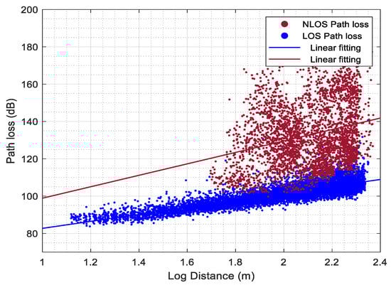 34]. The performance of the UMi is analyzed and compared with the previous works in terms of received power (often modeled by path loss) for LOS and NLOS conditions. It is worth mentioning that, the prediction correctness of the ray tracing simulator is validated based on the received power only, where it is more relevant to the buildings’ layout and materials (i.e., user-defined). Regarding the predictions of the other propagation characteristics, such as propagation time and angular properties, it is mainly defined by the designer of the ray tracer simulator. Therefore, they are not going to be involved in the validation.