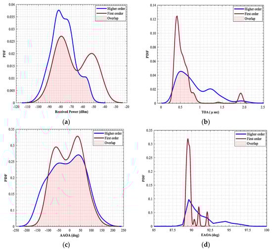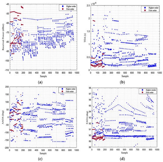 are the angle of departure and arrival of the received path, respectively. They also represent the horizontal and vertical angles of each path. However, from Equation (1), we can directly obtain several characteristics of the MPC, such as the received power, delay, and horizontal and vertical angles. In the following, a brief explanation of the impact of these characteristics for distinguishing the type of propagation path.