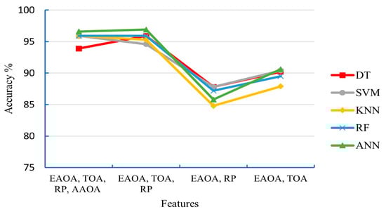 b represents the terms that modify the decision boundary of the classifier. In terms of the configuration and setup of the classifiers, the MATLAB classification learner app is used to design, train, validate, and test the proposed classifiers. For the training process, the Bayesian optimization algorithm is utilized. However, in order to prevent the overfitting of the classification learner, we enabled the validation method as mentioned before. Furthermore, since the obtained data is not highly dimensional, there are only four features used for classification; thus, the principal component analysis (PCA) won’t be activated in the classification learner. The training parameters, such as learning rate, earlier stop the training, etc., were set based on the default. Regarding tuning the hyperparameters of the classifiers, each classifier has specific hyperparameters. For example, the type of kernel for SVM, number of trees for RF, value of k for KNN, number of hidden layers, layer size (number of neurons), and activation function for the ANN. Trail and test method is used to select the optimal hyperparameter of the proposed classifiers.