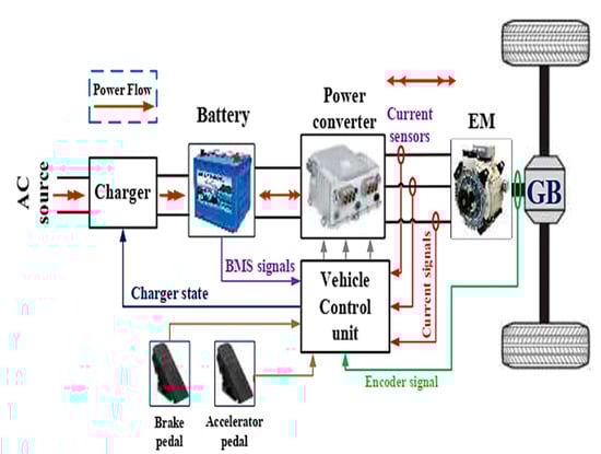 Propulsion, energy supply, and auxiliary subsystems make up the majority of an EV’s three subsystems. According to Figure 1, the propulsion subsystem is made up of the vehicle controller, power electronic converter, electric motor, mechanical transmission, sensors, and driving wheels [38,39]. The energy source, the energy management unit, the charger unit, and other elements are included in the energy supply subsystem [40,41]. The power steering unit, air conditioning motor and its controller, and the auxiliary supply unit make up the auxiliary subsystem. The electric vehicle drivetrain system (EVDS) is created by integrating the subsystems [42,43].