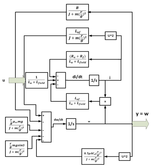 A nonlinear EV block diagram is presented in Figure 3. The EV system is classified into two main subsystems. The first is the electric motor drive system, and the second is the chassis of the body with suspension parts. The nonlinearity source comes from the mutual inductance of the motor winding; the system parameters variations are shown in Table 2. The purpose of the proposed controllers is to absorb external disturbances such as aerodynamic resistance, road variations, and several operating points of speed; moreover, the controllers overcome internal disturbances such as the mentioned nonlinearity resources, random noise, and uncertainty in the system parameters.