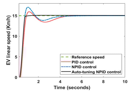 Figure 5 demonstrates the closed-loop dynamic behavior of the EV through a single operating speed. It can be noted that the auto-tuning NPID controller had a smooth response, low rise time and settling time, and no overshoot, which made the EV comfortable. In contrast, the other techniques (PID and NPID controllers) required a long time to stabilize the desired operating point. Moreover, they had a high overshoot, which made the EV’s motion unstable.