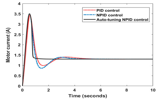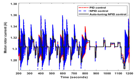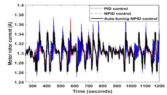 Figure 6 demonstrates the rotor winding current in amperes (A) of each control technique. It can be noted that the starting current was identical for the proposed controllers, while the current stabilized quickly in the case of the auto-tuning NPID controller. Both the PID and NPID had high fluctuations in current.