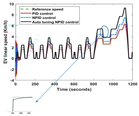 Figure 7 demonstrates the performance of the PID, NPID, and auto-tuning NPID to track the New European Drive Cycle (NEDC) speed (Km/h) test. It is obvious that the auto-tuning NPID controller tracked the speed profile accurately. Furthermore, the PID and the NPID controllers could not track the continuous changes in the speed profile. A zoomed area was taken from 980 s to 1020 s to ensure that the auto-tuning NPID had a small settling time and smooth behavior compared to other control techniques that did not have an adaptive mechanism.