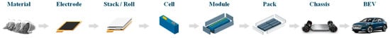 - Approach: Instead of building individual cells, a battery module is built up directly out of electrode stacks. Lithium–ion battery cells based on LNMC/LNCA cathodes exhibit a typical nominal voltage of around 3.6 to 3.7 V or 3.2 Volts if the cathode is based on LFP. A key performance indicator of the Electrode Stack-to-Module approach therefore is a larger voltage difference between the two module terminals, in the region of current battery modules, i.e., 7.2–59.2 V (nominal). Starter batteries in ICE vehicles are predominantly lead–acid batteries and can be described as an approximation to the Electrode-to-Module approach, as the individual cells do not have their own fully enclosed housing, but the 12 V lead acid battery consists of multiple serially connected electrode sets, which are separated by insulation walls [77] (pp. 247–264). A similar approach is conceivable for an advanced battery chemistry in which the inner jelly rolls/electrode stacks of a battery are not (only) connected in parallel, but (also) in series. Liquid electrolytes of current LIBs decompose under voltage differences higher than 4.2 V [78], which is why until now no industry implementation of LIB-based ETM system architectures can be found. However, next gen solid-state electrolytes can resist higher voltage differences and therefore enable bipolar stacking/a serial connection of the individual monocells [79,80].