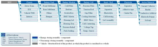 Since in battery-powered electric cars there is predominantly only one installation space available for the traction battery, in this paper the battery pack and battery system in passenger cars are considered equivalent. Nevertheless, larger commercial vehicles can provide several installation spaces for battery packs. Several battery packs are connected in series and/or in parallel to form one decentralized (mechanically distributed) battery system. Thus, a battery system comprises at least one or also several (intrinsically safe) battery packs. For example, the Volvo heavy duty electric truck has 90 kWh battery packs, of which up to six can be connected in parallel to form a 540 kWh battery system [25]. The number of possible system layers is debatable, but is here defined as eight for battery electric cars and nine for larger commercial BEVs, as their battery systems are typically multi-pack architectures [25,26,27]. Based on the defined system levels, the conventional battery electric vehicle structure can be detailed for cars as shown in Figure 2. An alternative approach is to use a domain-based product structure [15].