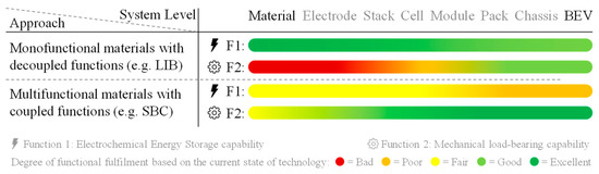 Figure 3 illustrates the key difference between both approaches. Monofunctional battery materials have excellent capabilities in the area of the electrochemical energy storage but lack the ability to carry mechanical forces on the lowest system levels. Structural integrity is only achieved from the level of the cell housing and improves through the higher levels of the integration. However, the mechanical load should not exceed certain limits; otherwise, faults/short circuits may occur inside the cell [35,36]. On the other hand, cells based on multifunctional materials aim to fulfil these two core functions—electrochemical energy storage capability and mechanical load-bearing capability—simultaneously and directly on the lowest system levels. The result is an excellent fulfilment of the mechanical functionalities but current prototypes of multifunctional cells based on SBC do not yet reach the energy densities of conventional/monofunctional LIB cells [32]. The qualitative rating of the function fulfilment in the following figure is based on the current state of research, which states that decoupled structural batteries generally outperform coupled versions [28]. The capability to store electrochemical energy is measured in Wh/kg or Wh/L, and the practical specific energy density decreases from the lower to the upper system levels [37]. The overall mechanical properties improve from the low system levels to the high ones. As several functions can be combined into a single entity, the number of system levels potentially required can be significantly reduced compared to the previews identified eight layers for battery electric cars and nine for battery electric trucks. This core idea is picked up through the following paper.