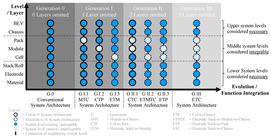 “Generation 0” (G 0) are “Conventional System Architectures” that use all previous identified system levels and are therefore based on eight layers—active material, electrode, electrode stack/roll, cell, module, pack/system, chassis/body (in white) and the overall vehicle/BEV (cf. Figure 1 and Figure 2). Within this solution space, a distinction is made to acknowledge the improvements of the last two decades. As no system level is skipped, the G 0 expressions are assigned based on the two different design approaches.