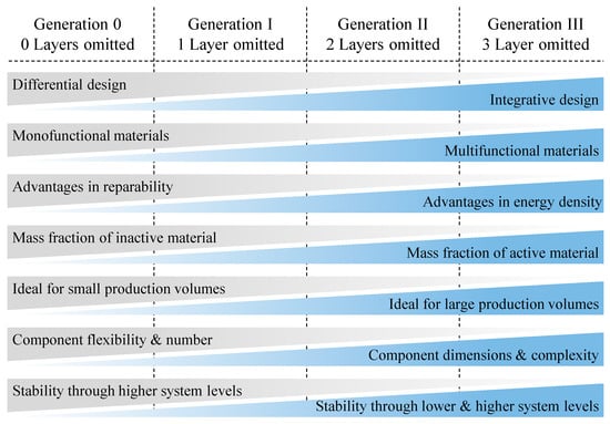 While Generation 0 uses a differential design approach, a trend toward function integration and thus integral design can be observed from G I systems onwards. This trend means that not only monofunctional materials with decoupled functions are used, but multifunctional materials with coupled functions are increasingly used in the higher generations. Generation 0 battery systems are generally good to repair, as components and assemblies (e.g., battery modules) can be exchanged due to their modular design. Higher generation systems offer advantages in terms of energy density as the number of parts and interfaces is reduced, but this also leads to inferior repairability. From Generation I onwards, primarily passive components (e.g., module housing, packing lid/chassis base) are omitted, which increases the share of active materials. Since differential design is fundamentally good for low volumes and integral design is fundamentally good for high volumes [97] (p. 85), there is a need for higher production volumes for the higher generation systems. Conversely, this can also be observed in Generation 0, as many of the conversion design vehicles listed above were produced in comparatively small numbers. Announcements from the industry confirm that the number of components is decreasing in the direction of the higher generations, while at the same time component complexity and dimensions are increasing due to multifunctionality. For Generation 0, the overall mechanical system stability is provided by the higher system levels, while the lower system levels (cells and levels below) are largely decoupled from the mechanical operating forces. From Generation I onwards, the operating forces are transferred more strongly to the lower system levels. Figure 5 summarizes these observations.