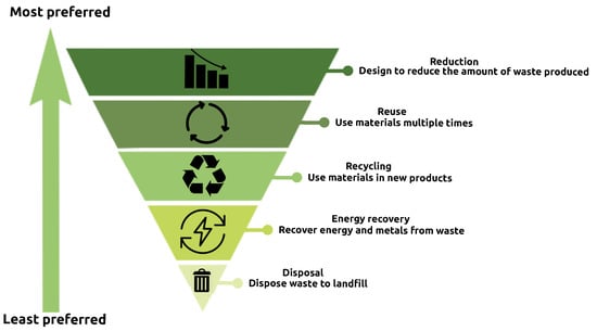 The waste management hierarchy shown in Figure 1 establishes an order of preference for actions to reduce and manage waste [5]. Reduction, reuse, recycling, recovery and disposal are the actions that should be taken to reduce the environmental impact of a product. Reduction is the preferred action and consists of designing the product in order to limit the waste it will generate at the end of its life. In the context of batteries, reduction consists of minimizing the number of materials used in a battery, in other words, reducing the size of the battery. Electric vehicles powered by smaller batteries would be more economical and more environmentally-friendly [6,7].