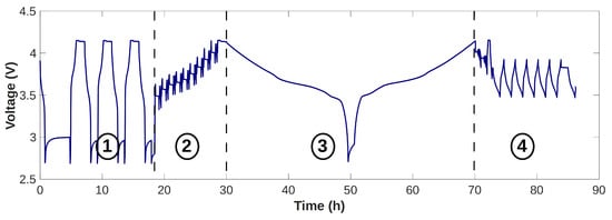 Voltage profile of the test. Step 1 is a capacity test, step 2 is the impedance measurement, step 3 is the low-current measurement and step 4 is the validation cycle.