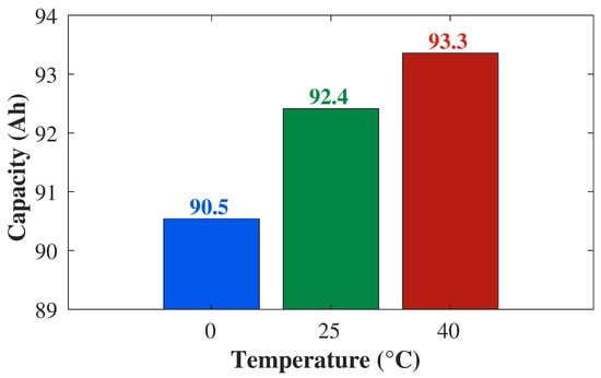 The capacity is measured in step 1 of the characterization test shown in Figure 3. The third measurement of discharge capacity in step 1 is taken as the reference and the capacity is calculated according to Equation (A1). Figure 4 shows the influence of temperature on the discharge capacity.